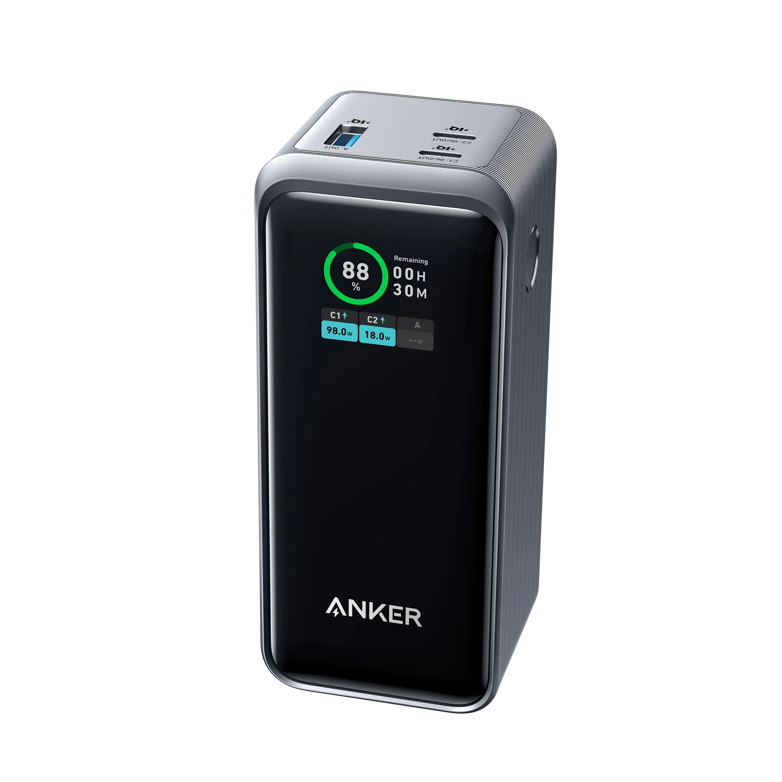 The Anker Prime 20000mAh (A1336011) is a high-capacity portable charger featuring 200W total output, two USB-C ports (up to 100W each) and one USB-A port, offering fast charging for laptops and phones, with 100W rapid recharging and a smart digital display, all in a compact design with ActiveShield™ 2.0 safety.